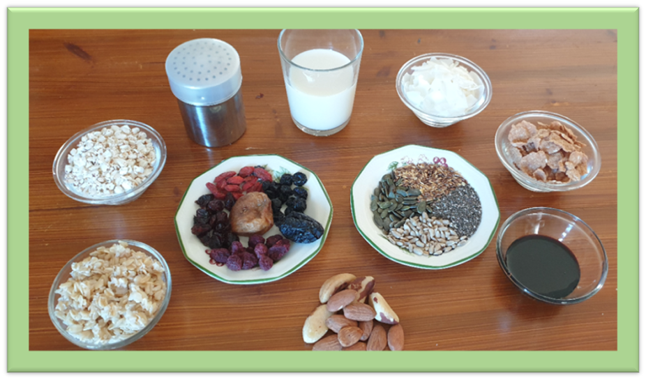 - Ακολούθως ετοιμάστε ένα σπιτικό Μούσλι στο οποίο θα αναμείξετε ότι σας αρέσει από τα πιο κάτω για να γεμίσετε ένα μπολ προγεύματος